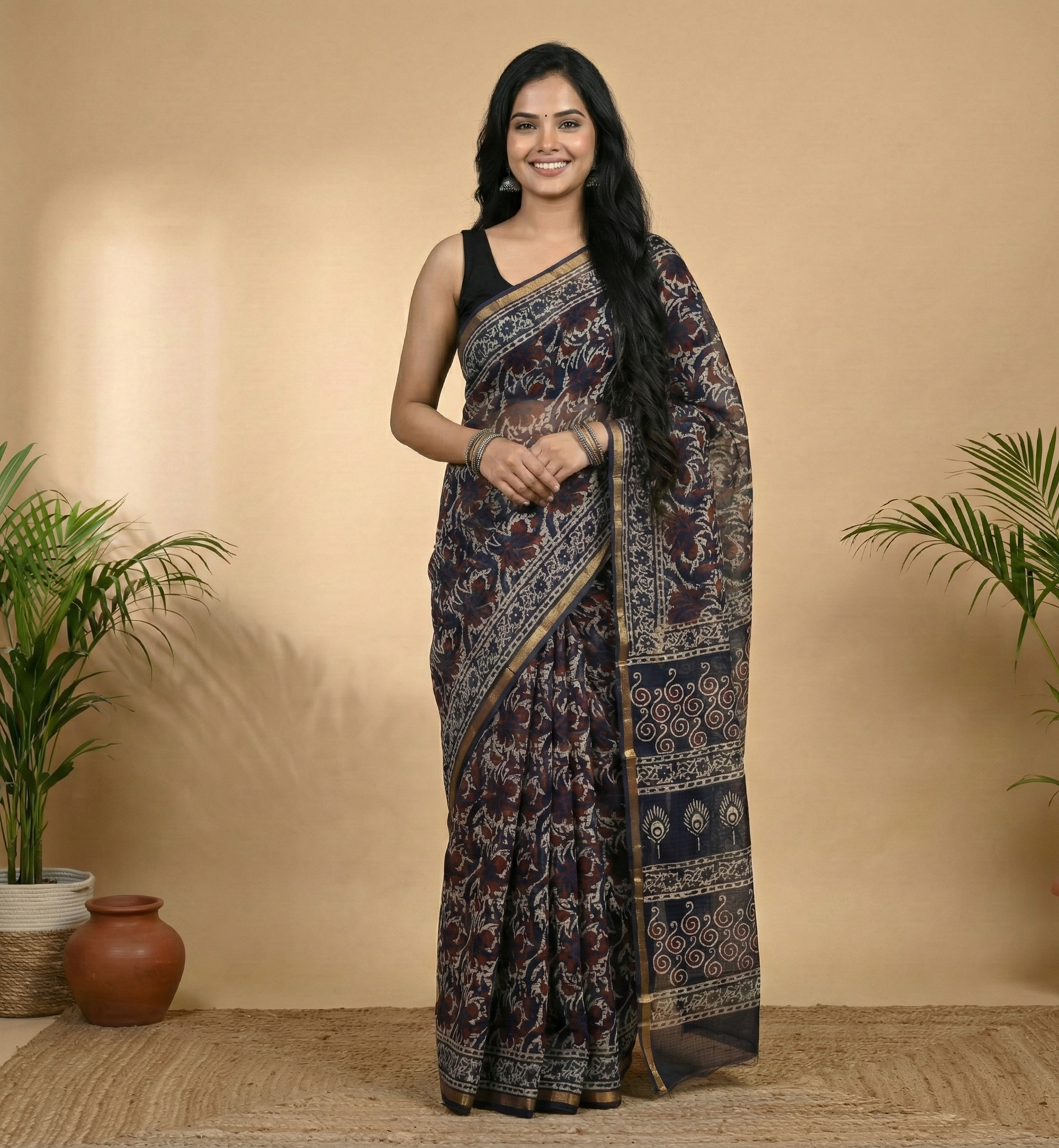 Navy Indigo Kota Doria Hand Block Premium Print Saree