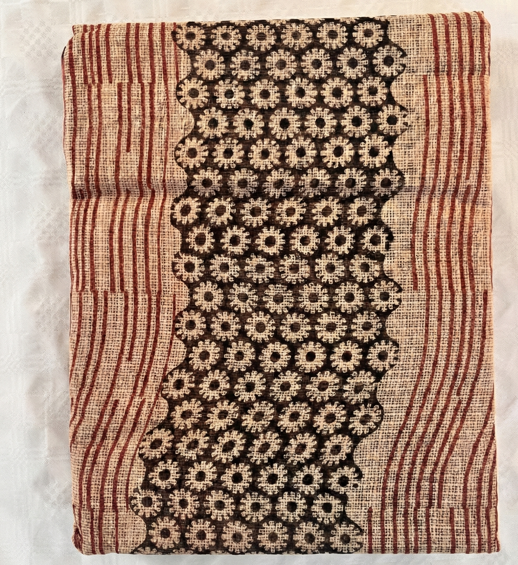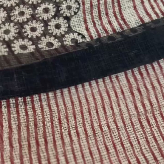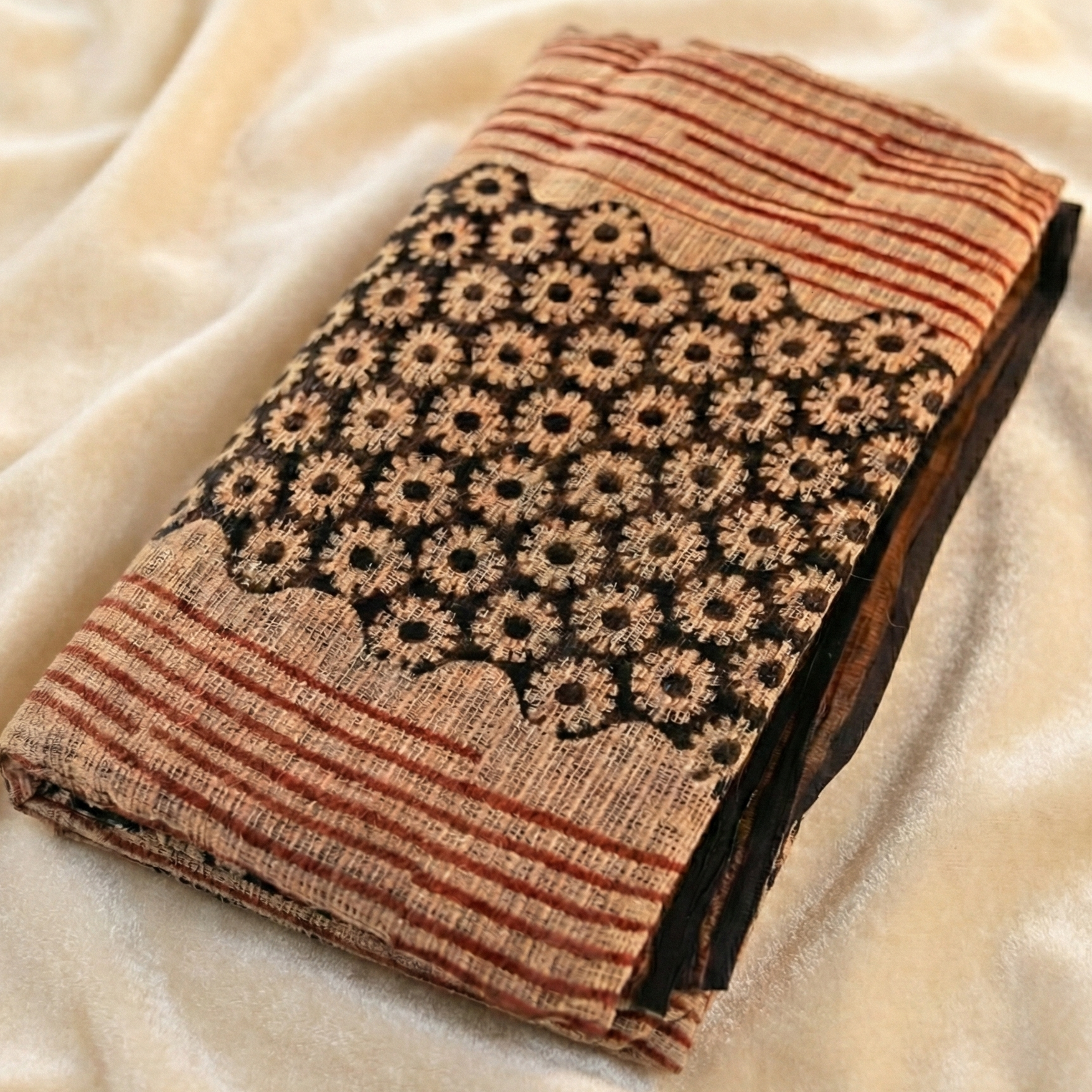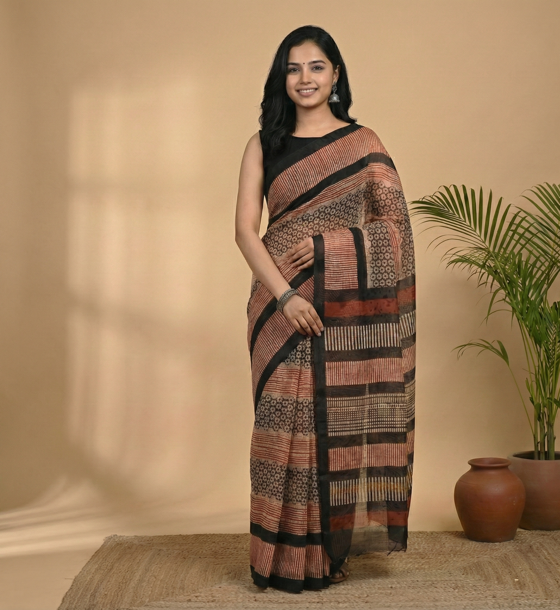 Lightweight Kota Doria saree crafted in a breathable cotton–silk blend with an airy open weave.Hand block printed in warm rust and black tones with traditional motifs and a refined zari-edged border.Effortlessly elegant, this saree is ideal for everyday wear as well as relaxed occasions.
